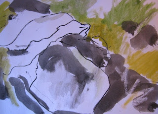 Here are three mixed media images from my sketchbook. Each picture is about 6" x 4". The middle one is a panorama of the Brecon Beacons from Cwmdare. The other 2 are details of rock scree.